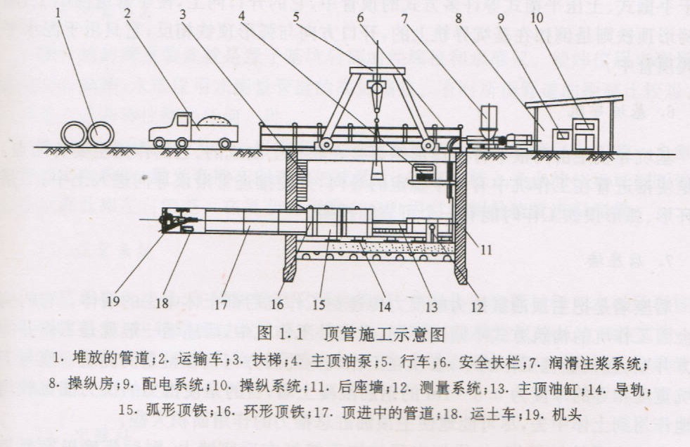 頂管施工就是借助主頂油缸及管道間的中繼間等的推力,把工具管或掘進機從工作坑內(nèi)穿過土層一直推到接收坑內(nèi)后回收的過程。與此同時,也就把緊隨工具管或掘進機后的管道埋設(shè)在了兩坑之間,頂管施工示意圖如圖1.1所示。一個比較完整的頂管施工大體包括以下部分。