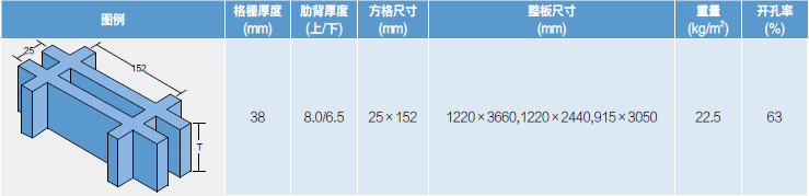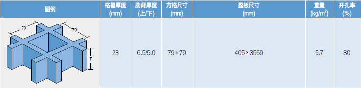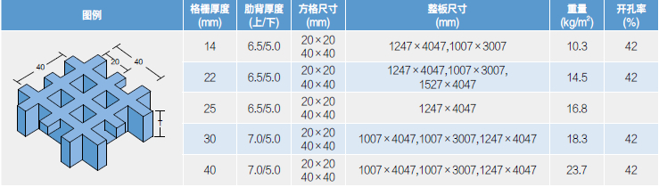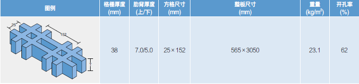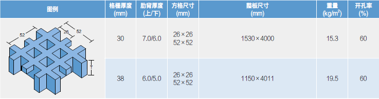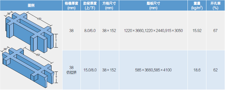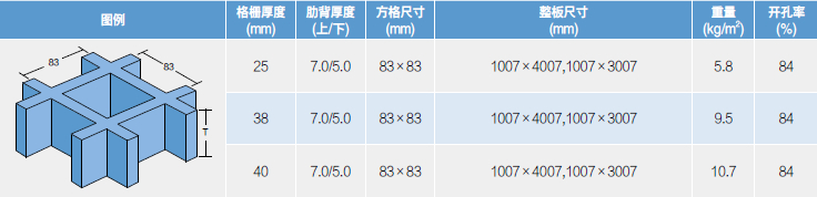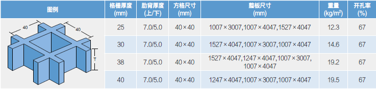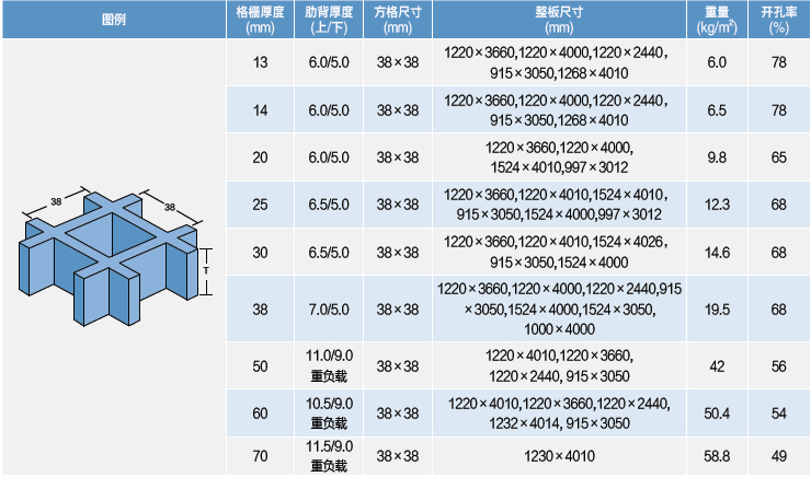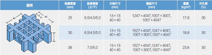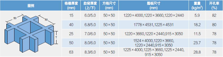 模塑格柵尺寸規(guī)格(厚度用“T”表示,方格尺寸為肋中心到肋中心,單位:毫米)