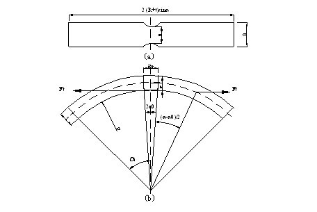 如圖8.6.2-1所示,設(shè)在測試時(shí)夾持面在試樣側(cè)面,其所受的使試樣產(chǎn)生拉伸的切向力是均布的,這樣可把夾持面的這種力簡化為一作用在試樣寬度和厚度中間層交線與圓心角(α-α0)的角平分線交點(diǎn)上的集中載荷,設(shè)該點(diǎn)載荷的大小為Ft。