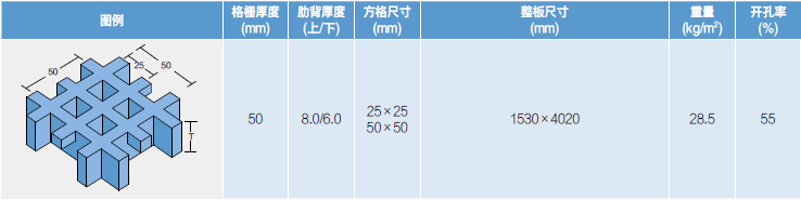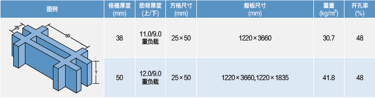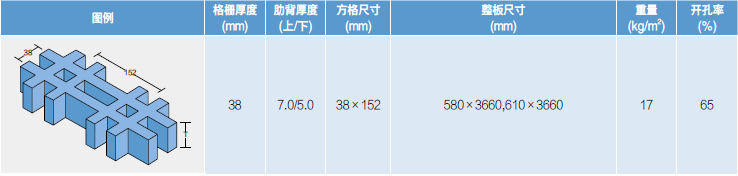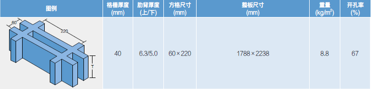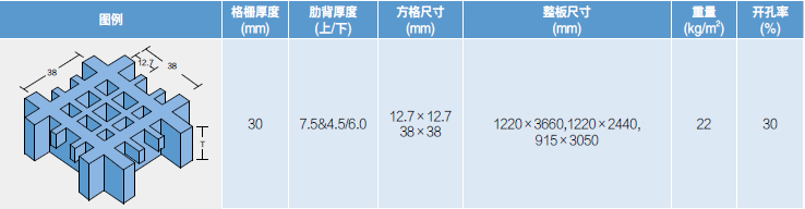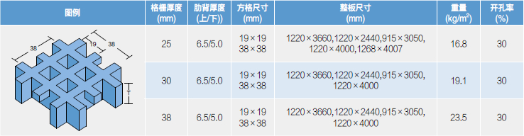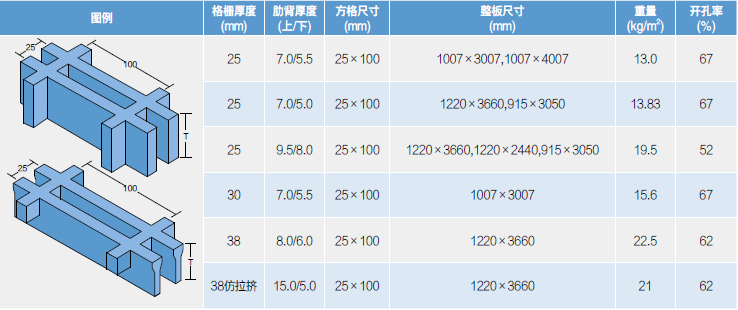 模塑格柵尺寸規(guī)格(厚度用“T”表示,方格尺寸為肋中心到肋中心,單位:毫米)